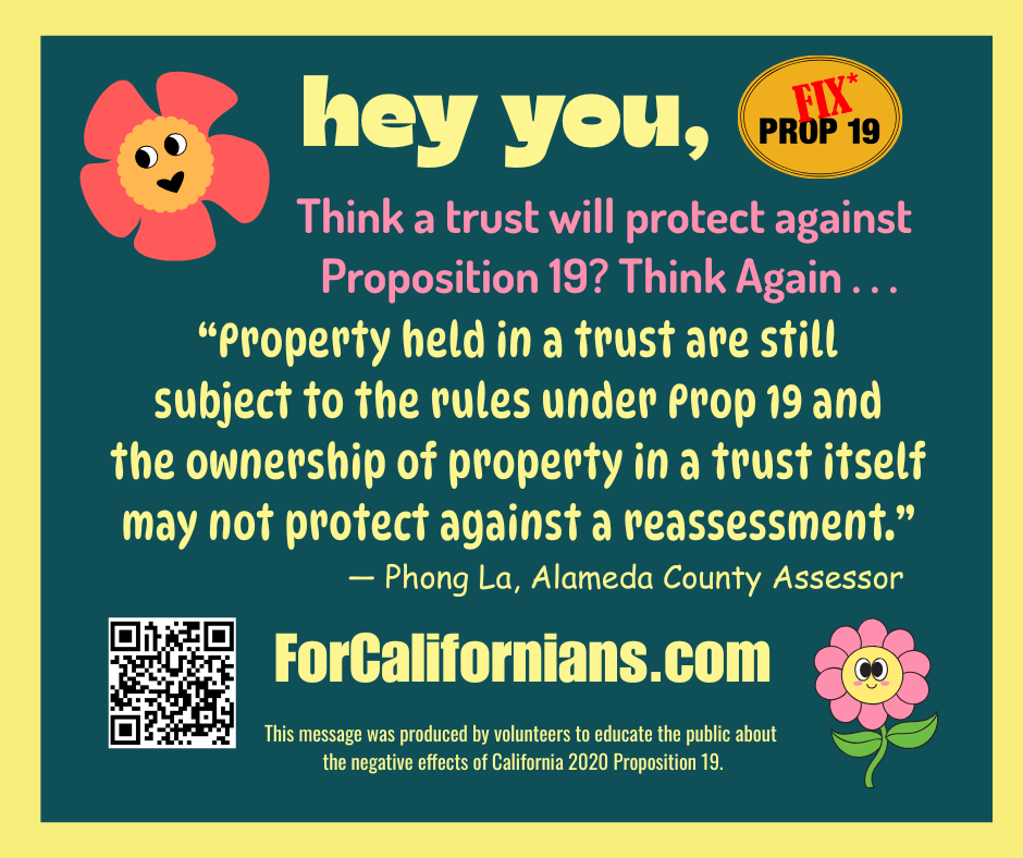 ALL Californians had the right to pass on their tax base to heirs. Prop 19 took that away. This is NOT about your Trust -can your kids AFFORD TO KEEP their home/rental/business?