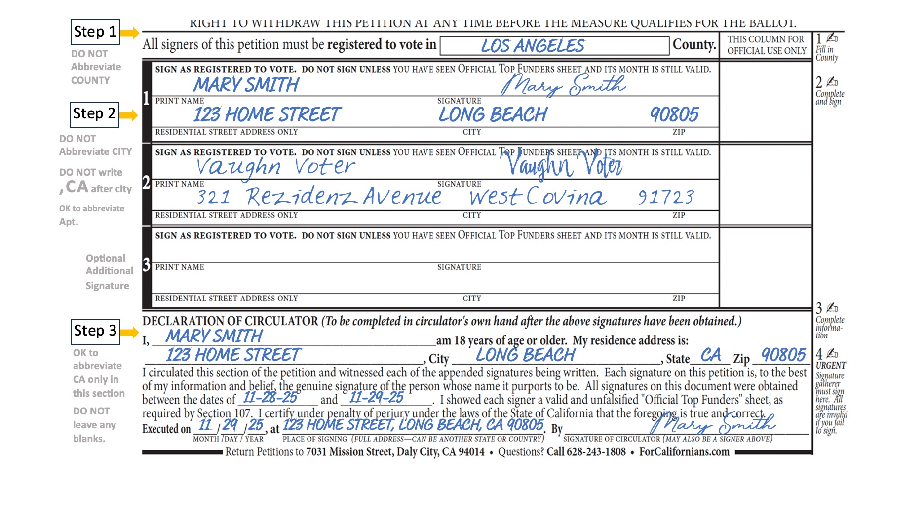 How to sign petitions. Government VERY PARTICULAR how they are filled in or else they are INVALID. There is a whole page dedicated to the details with examples and in STEP 5 you can reach out for help. https://forcalifornians.com/petition